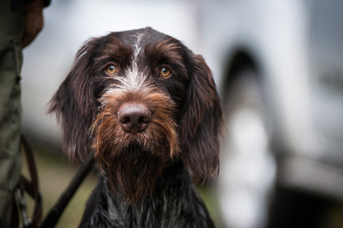 Brown dog with a pink tongue standing in tall grass